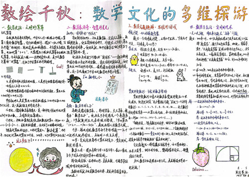 围绕“让数学讲故事”这一主题,同学们用画笔与文字为数学注入温度与情节。一等奖作品《数绘千秋》将圆周率π幻化为一条贯穿古今的“时间长河”,让数学史与文明进程在方寸纸页间生动流淌。
