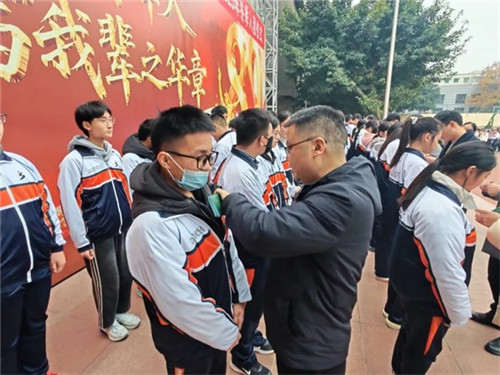 在全体师生的见证下,新团员入团仪式进入重要环节。学校党员教师代表与老团员一同上台,为新团员们逐一佩戴团徽、颁发团员证。