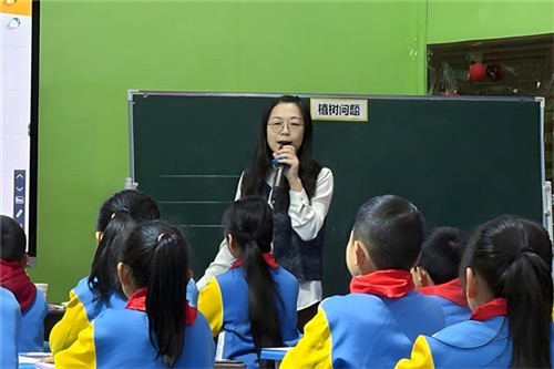 成都市双林小学御风分校杨璐情老师执教《植树问题》一课,以校园“植树方案征集令”导入,引导学生从真实问题出发,通过画图探究、算式说理,渗透一一对应与数形结合思想,自主建构“点数与段数”关系的数学模型,借助答题器等智能工具实现高效互动与即时反馈,同时结合生活实例实现思维进阶,展现了信息技术支持下“学为中心”的智慧课堂新样态。