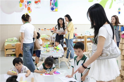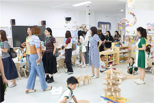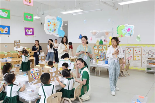 跟随脚步,在东安湖幼儿园教师的陪同下,名园长工作室成员们开始参观幼儿园环境,重点参观了班级科学区。每个科学区都根据幼儿的年龄特点精心设计,摆放着各种实验器材、自然材料和自制教具。在这里,孩子们可以自由探索光影的秘密、感受磁铁的魔力,或是观察植物的生长变化。孩子们亲手操作实验装置,记录着探索发现的观察笔记、充满创意的科学小发明……每一处细节都展示着孩子们在科学探索中的成长足迹。