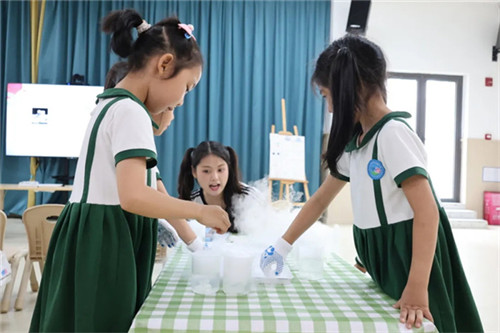 《3-6岁儿童学习与发展指南》强调“做中学、玩中学”的理念,而科学思维的培养正始于对现象的观察与追问。在集体教学活动中,一场以“神奇的干冰”为主题的探索之旅精彩上演。老师巧妙引导,孩子们围坐在一起,好奇地注视着干冰在各种实验中发生的奇妙变化。升腾的白雾、不断“生长”的气泡,一个个神奇现象激发着孩子们对科学的浓厚兴趣。