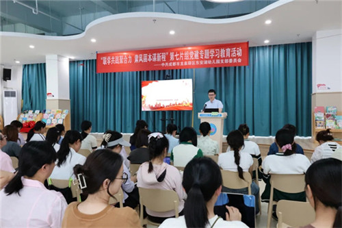 本次活动特邀拥有北大研究生学历的“蓉城先锋”龙泉驿区级讲师、龙泉驿区委宣传部办公室主任王俊康担任授课老师,参与人员包括东安湖幼儿园党支部书记蒋佳纹同志以及东安湖幼儿园全体教师、龙泉驿区学前教育第七片组党员教师、骨干教师等,共计约50人。