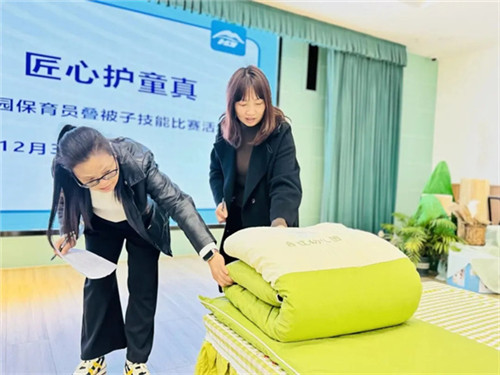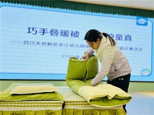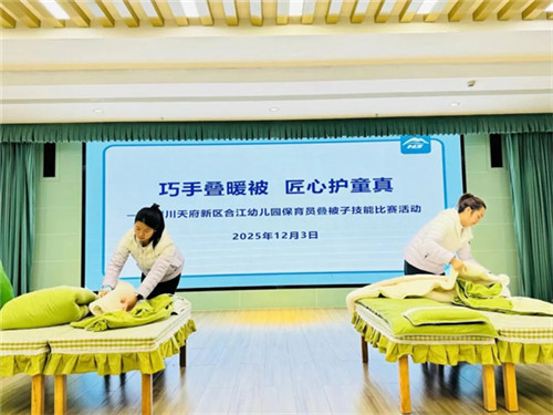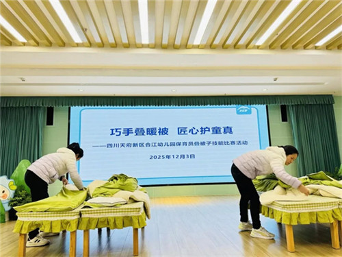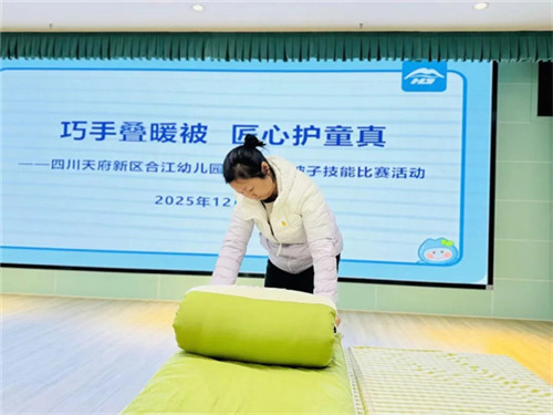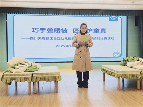 为进一步提升保育工作整体水平,夯实保育常规工作基础,推动保育流程精细化、规范化发展,2025年12月3日中午,四川天府新区合江幼儿园组织开展了保育员叠被子技能比赛。