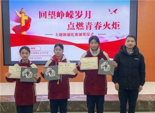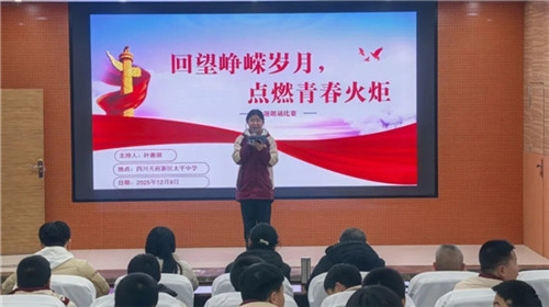 为传承红色基因,厚植爱国情怀,2025年12月9日下午,四川天府新区太平中学“回望峥嵘岁月,点燃青春火炬”主题朗诵比赛在文乾礼堂温情启幕。本次比赛由叶善琪同学主持,全校七至九年级12支班级队伍按抽签顺序依次登台,以声为媒,与历史对话,用青春之声传递奋进力量。