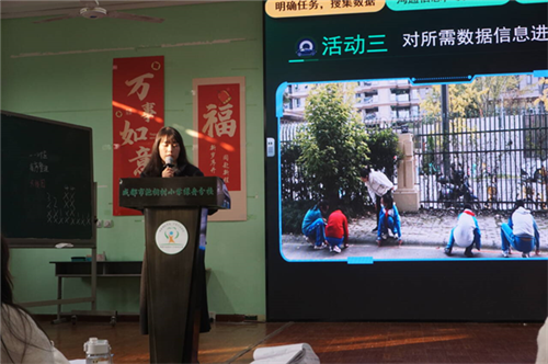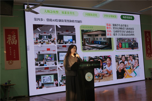 实验小学西区分校的王珍懿、雍佳蓉老师分享了跨学科教学四大核心环节,并以“AI赋能校园垃圾回收站改造”为例,展示了真实场景中如何培养学生的数学应用与协作能力。