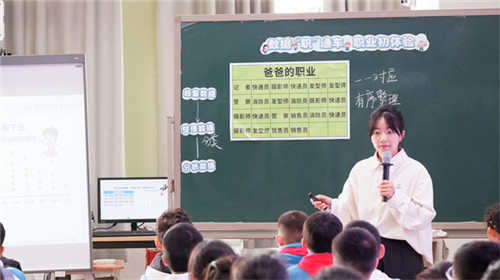 西财附小苏燕萍老师与三年级1班学生带来《数据“职”通车,职业初体验》一课。课堂从家庭职业调查切入,学生自主探索数据整理方法,重点掌握点线图运用,在互动中深化“分类”“有序”的数学思想。借助AI解读职业变迁趋势、生成梦想职业画像,既落实了统计单元教学要求,又让学生树立了正确的职业观。