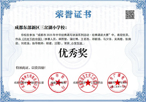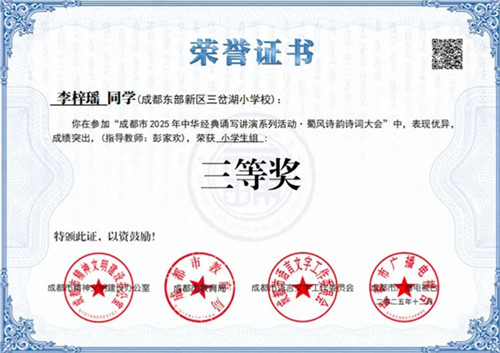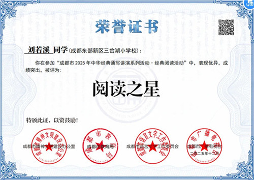 三岔湖小学学子林熙智、蒲红博、王若西、马夕淳、吴禹橙、张旖歆,刘若溪在成都市2025年中华经典诵与讲演系列活动—诵读经典中荣获成都市优秀奖;李梓瑶同学在蜀风诗韵诗词大会活动中荣获市级三等奖;刘若溪同学在成都市2025年中华经典诵与讲演系列活动中获阅读之星称号。