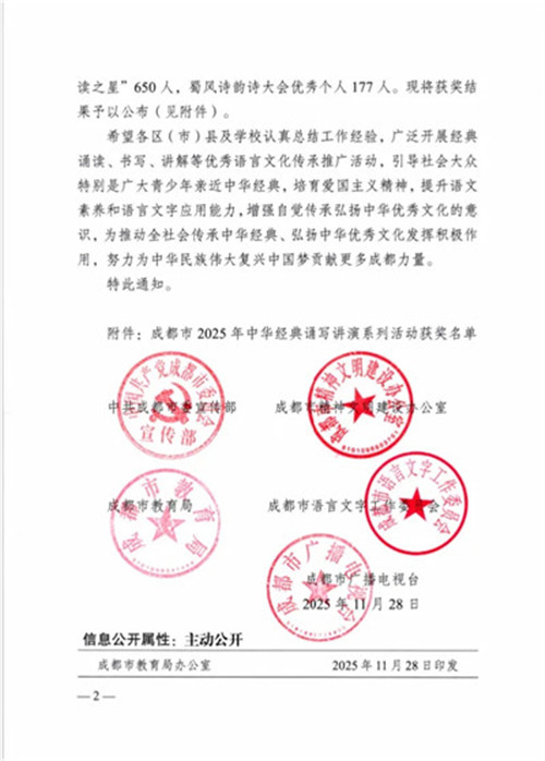 成都市2025年中华经典诵写讲演系列活动及成都东部新区区级评选活动自五月启动以来,成都东部新区三岔湖小学校学子展现出扎实的文化功底和出色的表现。近日,评选结果相继揭晓,该校在众多参赛队伍中脱颖而出,荣获市、区两级多项荣誉,绽放经典魅力!