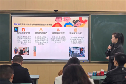 初中英语组郑依玲老师以“以师为光,AI为芒”为题,分享了英语教学中AI工具在情境创设、互动增强和个性化评价方面的创新实践。