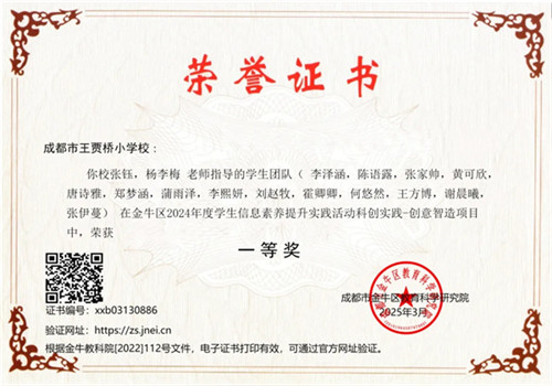 在四川赛区第二十届宋庆龄少年儿童发明活动、全国青少年信息素养大赛中,王贾桥小学40余名学子不负众望,凭借扎实功底斩获多项荣誉;2025年全国青少年信息素养大赛——创意工程主题赛、Python编程等赛项中,7名同学成功晋级国赛,于8月暑假期间奔赴乌镇,与全国优秀学子同台竞技、切磋交流,最终斩获国家级二等奖6人、三等奖1人,让成都市王贾桥小学的科创名片闪耀全国赛场。