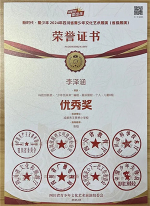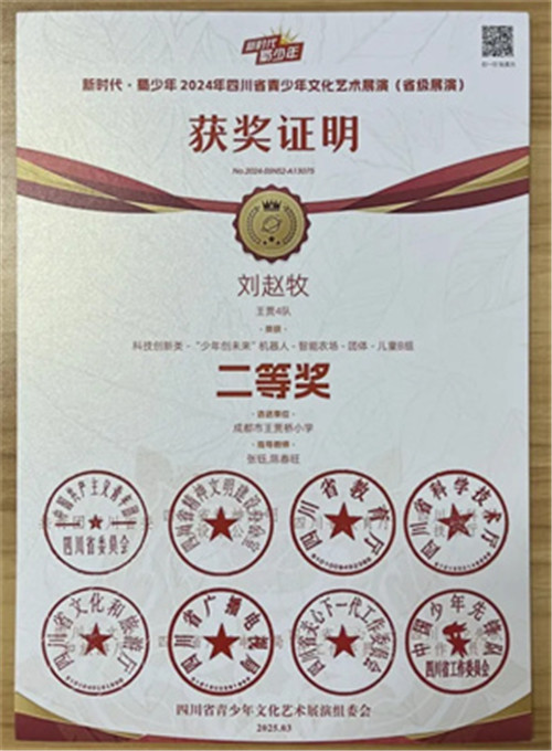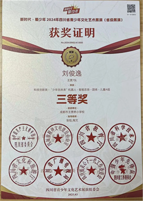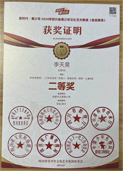 在新时代蜀少年四川省青少年文化艺术展演科技创新类活动中,王贾桥小学再创突破、佳绩斐然。全校10名同学凭借过硬实力,成功晋级编程、机器人赛项省级展演,最终收获省级一等奖2人次、二等奖4人次、三等奖2人次、优秀奖2人次,用汗水浇灌出沉甸甸的荣誉。
