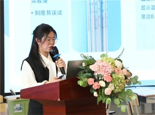 课后,龙江路小学分校南区学校科学教师张欣然代表磨课团队从教学目标与教学设计入手,解析思维支架在课堂中的搭建逻辑。林丹丹结合课例,以《优化实验载体 促发概念建构》为题,分享了她在实验教学中的实践思考,清晰呈现了如何从材料与装置等实验载体的优化入手,逐步引导学生深入理解科学概念的课堂路径。