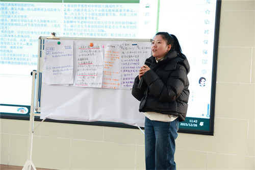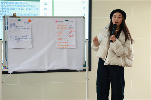 小组交流环节,双流区通江幼儿园园长周莉、高新区石羊六幼石婧老师、青白江巨人树幼儿园何丽老师代表各组作分享。三位老师从音乐选择、道具设计、互动策略、幼儿发展等方面进行了全面而准确的分析,既肯定了活动中情境创设、师幼呼应等亮点,也提出了极具建设性的优化建议,让在场教师在思想的碰撞中拓宽视野、启迪思路。