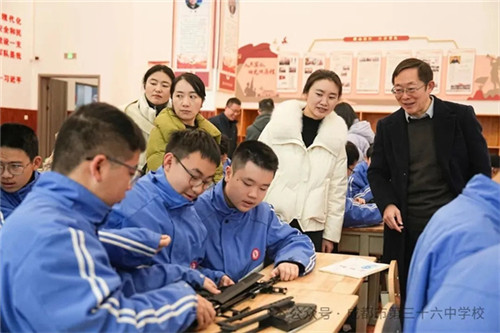 调研团循着校园国防教育建设脉络,先后走访钟楼、长征大道、拥军广场、校史馆、国防展厅等特色场所,在实地观摩中,直观感受学校将国防元素融入校园环境的匠心设计,深切体会“为党育人、为国育才”办学宗旨的生动实践。随后,调研团走进国防教室,观摩国防教育示范课与轻武器射击体验活动,课堂上,理论讲解与实践操作有机结合,学生们专注参与枪械组装实践,一拆一装间,组装的是枪械零件,增长的是家国担当,充分展现学校国防特色课程的鲜明亮点与扎实成效,为国防教育课程建设提供了可借鉴的川渝经验。