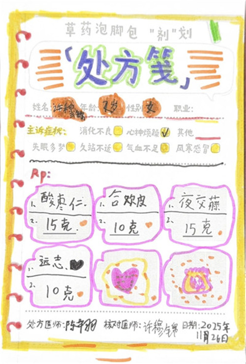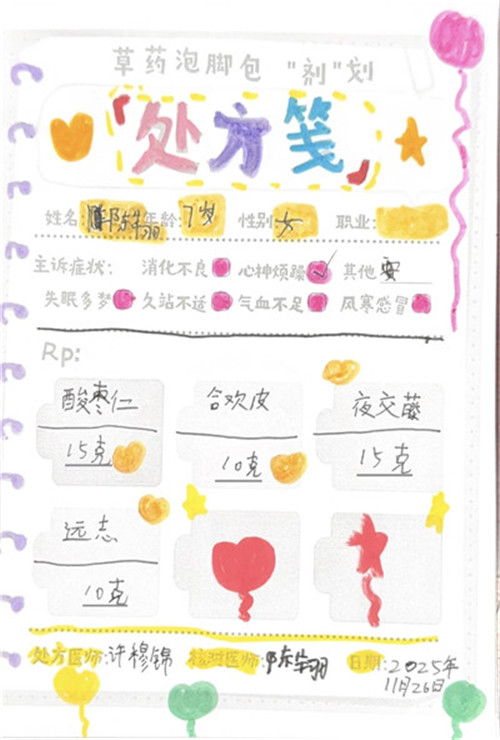 “如何配出一款好药包?”孩子们学习经典配方,化身“小小医师”,为家人朋友量身设计配方。一份份“个性化泡脚包草药处方笺”背后,是细致的观察与温暖的关切。