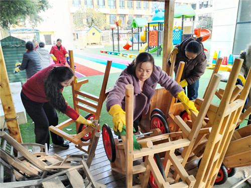 全体教职工分工协作,对园所环境进行了全方面清理。大家对教室、图书室、户外操场区等公共区域进行了彻底清扫,对玩具、图书、运动器械等幼儿高频接触物品进行清洗、消毒,确保无遗漏、无盲区。