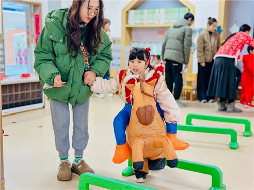 清晨的幼儿园门口早已充满欢声笑语,孩子们身着新年服饰早早等候,眼神里满是期待与雀跃。让孩子们欣喜的是,深受喜爱的东哥与万老师化身为“吉祥小马”,穿着小马玩偶服站在门口迎接大家。
