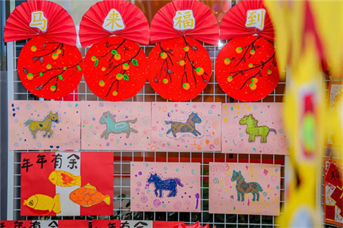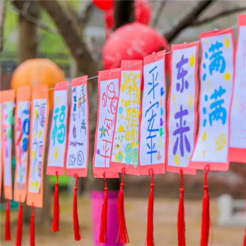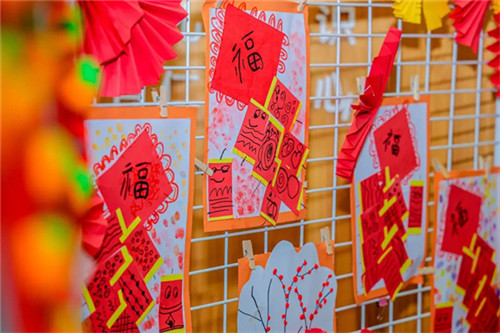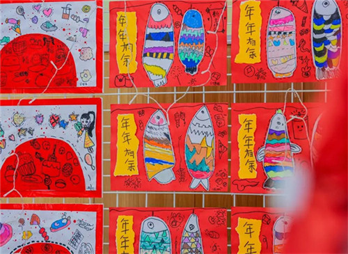 长廊变身成一条流动的色彩河。每个班级精心打造的展区里,挂满了孩子们亲手绘制的“年”:有稚嫩笔触勾勒的红灯笼,有五彩颜料涂抹的新年乐园,还有歪歪扭扭却格外可爱的“福”字。每一笔色彩都是孩子们对新年的期待,每一幅画作都是成长的见证。