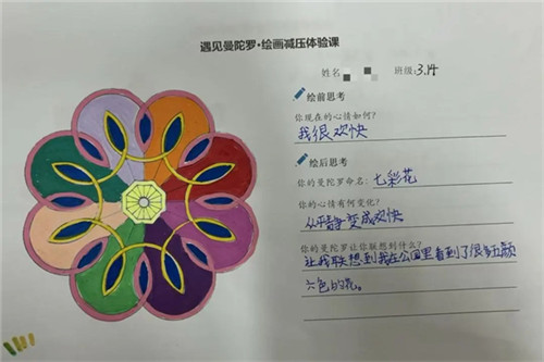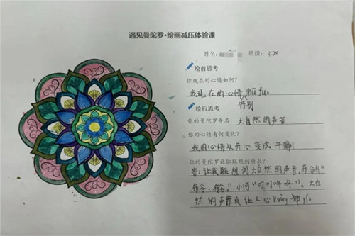 心理老师刘婷带领三年级心灵气象员开展了“遇见曼陀罗”主题培训。活动中,气象员们在轻柔的音乐中自由绘制曼陀罗图案,通过色彩表达当下情绪,体验专注与静心。刘婷引导大家不必追求完美,只需跟随感受,在绘画中学习情绪觉察与释放。分享环节中,不少委员表示“涂色让心情变得平静”。