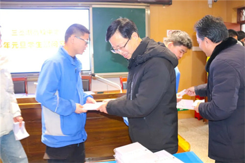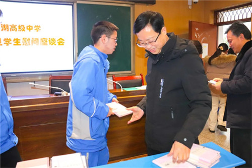 最后,陈俊义、钟才平共同为在场的学生代表们送上了学校精心准备的元旦慰问礼品。同学们接过礼品,脸上洋溢着感动与喜悦的笑容,现场掌声阵阵,暖意融融。