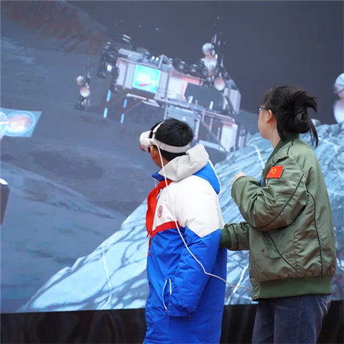 光听还不够,沉浸式体验才够“燃”!戴上VR眼镜,孩子们瞬间“穿越”到月球表面,环形山、陨石坑近在眼前,逼真得让人忍不住想伸手触摸。“像在太空飞!”“我看到月球啦!”体验区里,代表们的惊呼声与欢笑声交织成一片。