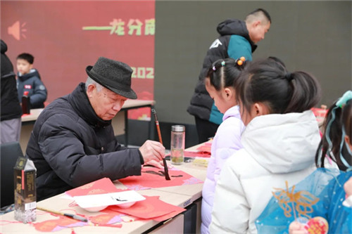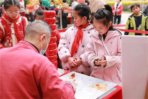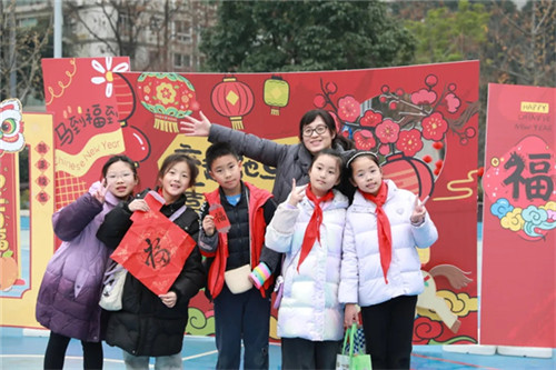 旗台边的墨香摊位前,松烟袅袅,家长书法志愿者挥毫泼墨,狼毫落纸间,一个个遒劲有力的“福”字跃然纸上。墨迹未干的福字刚晾好,就被师生们小心翼翼地叠进衣兜,连摊位的招牌上,都贴着沾着墨香的福字,暖意融融。