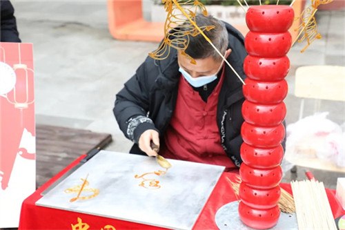 中庭的糖画摊前,早已围得水泄不通。非遗艺人手持铜勺,糖浆如丝般倾泻而下,转眼间,一匹匹灵动的小马糖画便成型了。刚凝好的糖画还带着温热的甜香,就被举着福币的孩子们争先恐后地捧在手里,举着满场奔跑,糖香一路飘散。