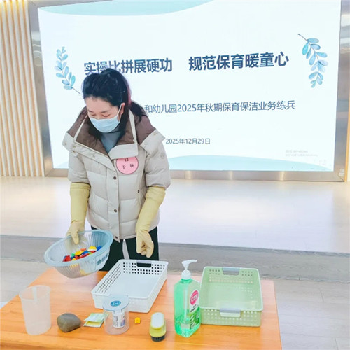 为进一步提升保育保洁队伍专业水平,筑牢幼儿健康安全防线,近期,成都市双流区协和幼儿园三个园区组织全体保育保洁开展了一次系统、扎实的业务练兵活动。本次活动坚持理论结合实践,针对各园区实际需要,精准施策,实现“一园一策、分层练兵”,取得了良好效果。