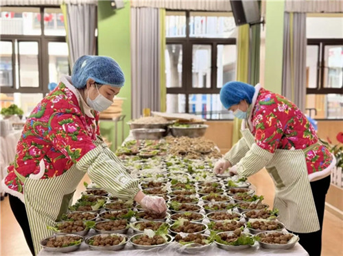 后厨内,新鲜的时令果蔬、优质的肉蛋水产等食材整齐拼配,厨师们兼顾营养与颜值,将普通食材雕琢成寓意吉祥的美味佳肴。