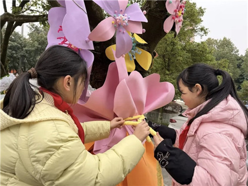 在今年学校的少先队代表大会上,一份“用童趣装饰点亮校园树木”的提案被正式采纳。手工社团的队员们主动承担任务,从设计到制作全程自主完成,生动践行了“自己的活动自己搞”的少先队传统。
