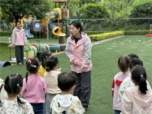 虎燕灵老师带领新教师观摩园所环境,从充满创意的班级特色活动区域到绿意盎然的户外自然空间,均体现园所“美好”文化。