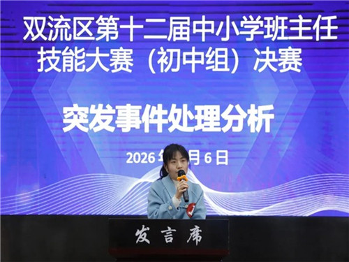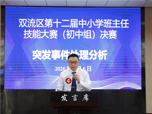 2026年1月6日,双流区第十二届中小学班主任技能大赛(初中组)决赛在成都市双流区棠湖中学实验学校顺利举行。本次大赛,双流区各中学班主任代表齐聚现场,共研育人智慧,共促专业成长。为全面落实立德树人根本任务,进一步提升班主任队伍的专业素养与育人能力,大赛自2025年10月启动以来,历经初赛、片区复赛的层层选拔,最终有8支优秀队伍脱颖而出,齐聚决赛现场,共展教育智慧与育人情怀。