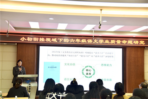 在案例分享环节,胜西小学语文组陈赵静、杨媛老师以“让素养在阅读命题中自然生长”为题,带来了干货满满的实践分享。这份精彩汇报的背后,是学校语文组数月的深耕细研。接到分享任务后,语文组迅速组建核心教研团队,以“落实核心素养、衔接初中教学”为出发点,逐字逐句解读课程标准,梳理六年级语文核心知识点与能力要点;对照初中语文教学要求,查找学段衔接的关键点与生长点;反复研读教材文本,从课文例题、课后练习中提炼命题思路。同时,叶敏也给予了教研团队悉心指导与智慧引领,在叶敏的一步步引导中,老师们将视野从“知识层面”真正提升至“素养层面”。最终形成的阅读命题方案,既实现了语言运用、思维能力、审美鉴赏等核心素养的融合考查,又推动了阅读评价从知识本位向素养立意转型,充分彰显了“教—学—评”一体化的教学理念。