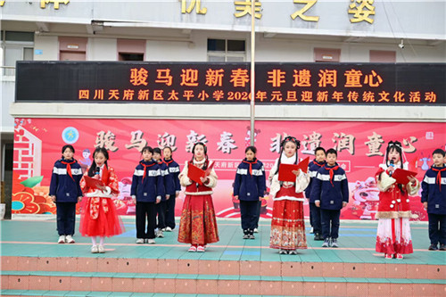 马年将至,非遗飘香!12月30日下午,四川天府新区太平小学足球场化身传统文化欢乐场,一场以“骏马迎新春,非遗润童心”为主题的元旦活动热烈开启。