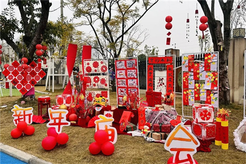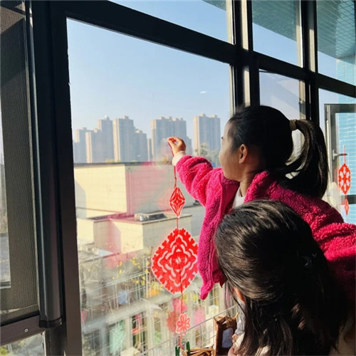 每一处装饰都是孩子的劳动成果,孩子们拉着爸爸妈妈的手,骄傲地指认“这个福字是我剪的”“那串灯笼是我们班挂的”。环境不再是单纯的装饰,而是孩子成就感的可视化呈现,也让家长直观感受到孩子的创意与能力。