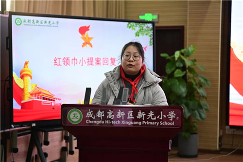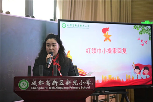 会上,三(4)中队任佑嘉、三(5)中队赵思宸作为代表分享了他们的提案。新光社区党委副书记赖思蕾、德育处副主任赵进现场予以细致、认真地答复。