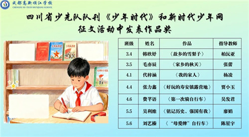 在四川省《少年时代》及新时代少年网征文活动中,顺江学校学子笔耕不辍,多篇佳作发表获奖。同学们以文字为媒,记录生活之美、亲情之暖、成长之悟,既展现了扎实的写作功底,更传递了积极向上的青春正能量。