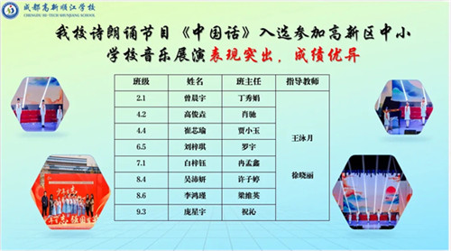 由王泳月、徐晓丽老师指导的诗朗诵《中国话》节目,成功入选高新区中小学校音乐展演。语言与旋律相融,情感与文化共生,同学们以铿锵语调传递母语之美,用真挚情感彰显文化自信,展现出新时代少年的精神风貌。