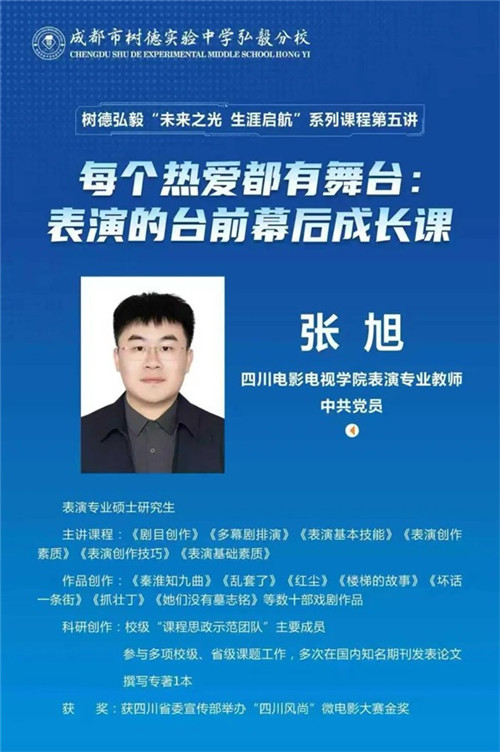 在青春的成长画卷中,艺术是那绚丽的色彩,为同学们的精神世界勾勒出丰富的轮廓;而思政教育则是那坚实的底色,赋予青春以正确的方向和深沉的力量。近日,成都市树德实验中学弘毅分校的阶梯教室摇身一变,成了充满艺术气息与欢乐氛围的梦幻剧场,来自四川电影电视学院表演专业的张旭老师,带着他对表演艺术的无限热爱与深厚造诣,为初一初二的同学们带来了一场名为《每个热爱都有舞台:表演的台前幕后成长课》的精彩讲座,如同一束光,照亮了同学们心中对表演艺术的好奇与向往,更如同一座灯塔,为同学们的成长指引了方向。