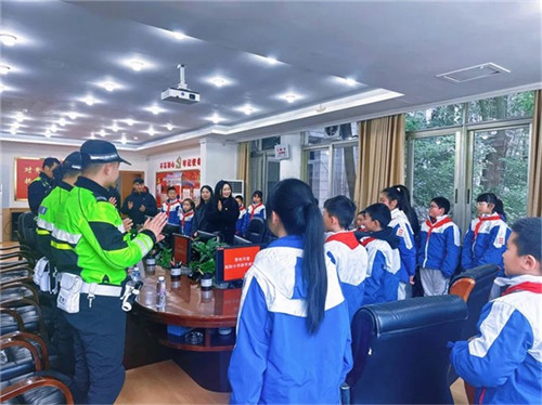 活动伊始,付警官便引导师生们有序参观分局交通指挥大厅,同时结合真实交通案例,生动讲解了交通信号、标志标线的含义与日常出行安全要点。同学们还亲手操作了成都车架管服务自助受理机,在点击和触摸中,第一次感受到了“智慧交通”的奇妙。