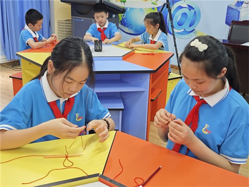 宋语、蔡镜衡同学把麻绳揣进了书包,课余时间,走廊、教室、操场都成了他们的“绳结工坊”。从麻绳打结的松紧把控到中国结的纹路编织,每一个细节都进行反复打磨,两位指导老师全程跟进,耐心点拨技术难点,陪伴他们稳步前行。