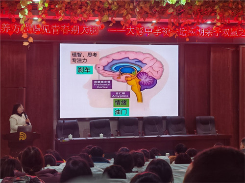 讲座伊始,专家以趣味握拳暖身互动切入,让家长们联想到与孩子相处的困境。其实,这些看似“叛逆”的问题,并非孩子态度使然,核心原因在于青春期大脑的特殊发育阶段——大脑分为理智脑与情绪脑,情绪脑4岁时发育已达70%,而理智脑要到25岁才完全成熟。用“油门与刹车”的生动比喻来说,情绪脑是“油门”,容易冲动发力;理智脑是“刹车”,尚未发育完善,难以精准调控,这便是亲子矛盾频发的关键所在。