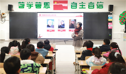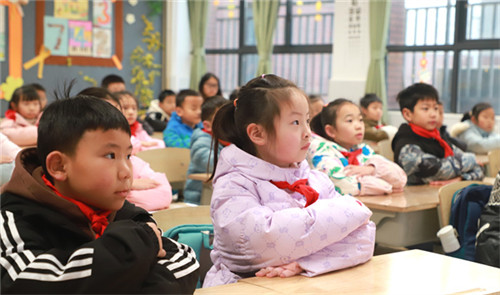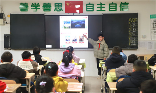 随后,主题宣讲环节中,两位小主持人用童趣十足的语言,带领同学们开启生活中的科技奥秘之旅,细数中国科技的亮眼成就:“蛟龙”“奋斗者”深潜大洋,“长征”“天问”遨游苍穹,“嫦娥”探月,“祝融”探火,“天和”空间站驻留太空,华为5G,中国天眼跻身世界前列……一个个鲜活的案例让同学们发出由衷惊叹。在科技榜样介绍环节,小主持人用浅显易懂的话语讲述着科学家们的坚守与奉献,向“科技英雄”致以崇高的敬意。“少年强则国强”,师生们共同喊出“科技创新,强国有我”的口号,将现场氛围推向高潮。