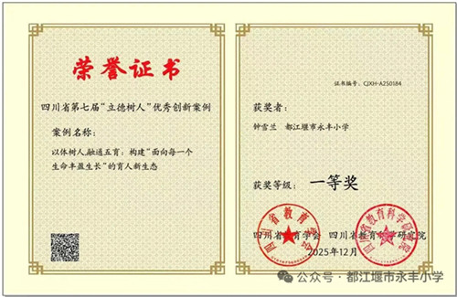 近日,四川省教育学会、四川省教育科学研究院联合发布了四川省第七届“立德树人”优秀实践创新案例获奖名单。都江堰市永丰小学报送的案例《以体树人,融通五育:构建“面向每一个生命丰盈生长”的育人新生态》凭借扎实的实践积累、创新的育人理念和显著的实施成效,在众多参评案例中脱颖而出,成功荣获一等奖!