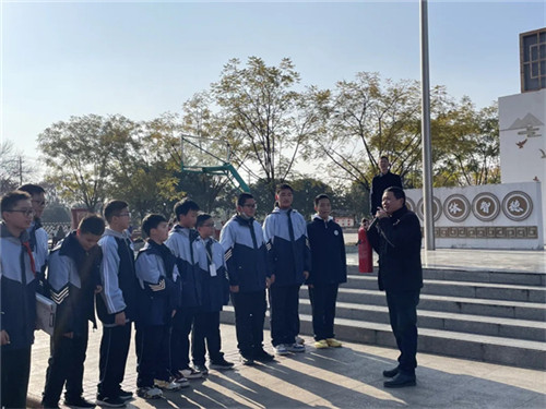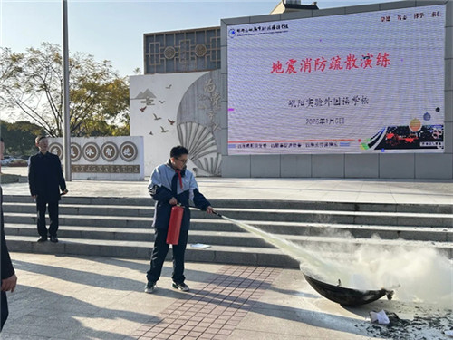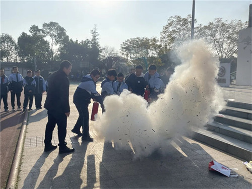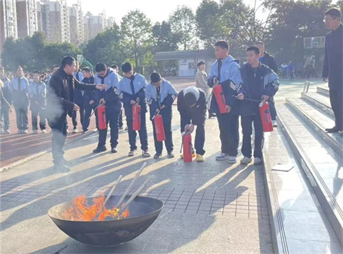随后,演练进入消防安全技能实操环节。副校长廖正勇为同学们现场讲解并演示了干粉灭火器的正确使用方法,重点强调了“提、拔、握、压”四步操作要领。在认真观摩学习后,多名学生代表在安保人员的指导下,轮流进行实际操作,成功扑灭了模拟火源,切实掌握了灭火器的使用技能。