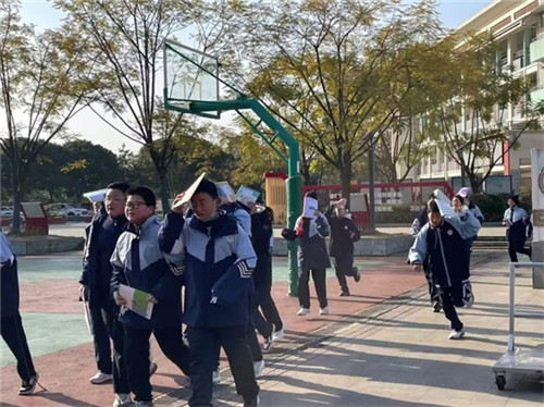 下午15时50分,随着第一声“地震警报”响起,演练正式开始。上课师生迅速反应,立即采取紧急避震措施,就近蹲在课桌旁或墙角,用书本护住头部。约一分钟后,“疏散警报”响起,全体学生在班主任和楼层指挥老师的引导下,弯腰低身、以书掩头,沿预定疏散路线快速、有序地向操场安全区域撤离。整个疏散过程紧张而有序,全校师生均在规定时间内安全到达指定集结位置。