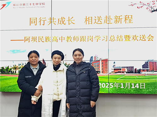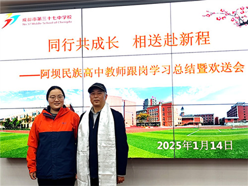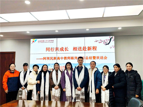 为深化校际合作交流,总结跟岗学习成果,传递教育温情,2026年1月14日,“携手同行共成长 暖心相送赴新程——阿坝州民族高中跟岗教师学习总结暨欢送会”在成都市第三十七中学(以下简称:成都三十七中)举行。阿坝州民族高中跟岗教师、成都三十七中跟岗指导教师、校领导及处室负责人齐聚一堂,共话成长、共叙情谊。会议由教师发展中心主任田茂华主持。