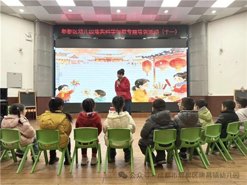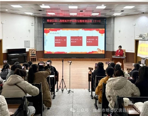 2026年1月15日,由成都市郫都区学前教育管理中心主办、成都市郫都区唐昌镇幼儿园承办的“传物·传声·传情——幼儿说明性讲述里的文化印迹”专题培训活动顺利召开。郫都区学前教育管理中心教研员杨群,彭州市机关幼儿园党支部书记、园长、彭州市任晓薇名师工作室、党组织书记工作室领衔人任晓薇及其工作室成员,全区公民办幼儿园(园区)骨干教师共计300余人齐聚一堂,共探本土文化与幼儿语言教育的融合之道。