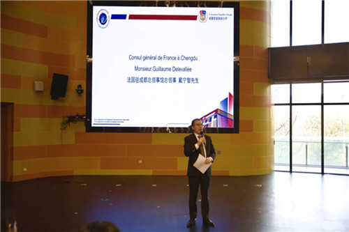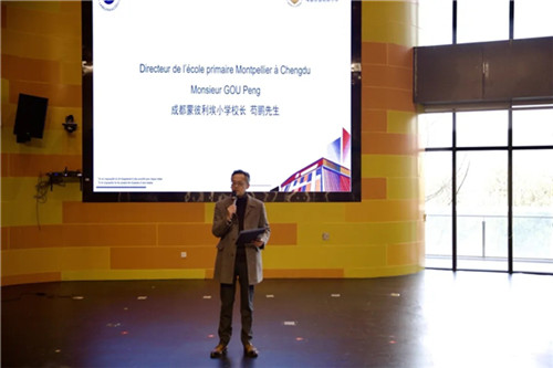 仪式现场氛围庄重而热烈。伴随着中法双语小主持人的热情开场,仪式正式拉开帷幕。首先,芶鹏致辞。他回顾了学校自建校以来在中法人文交流以及教育方面的探索实践,感谢法领馆支持,并表示将以此次认证为契机深化国际教育交流。接着,Guillaume Delevallée致辞祝贺,他肯定了成都蒙彼利埃小学在法语教学与中法人文交流中的重要贡献,认为这是中法教育合作的生动例证,期待拓展合作、共促发展。