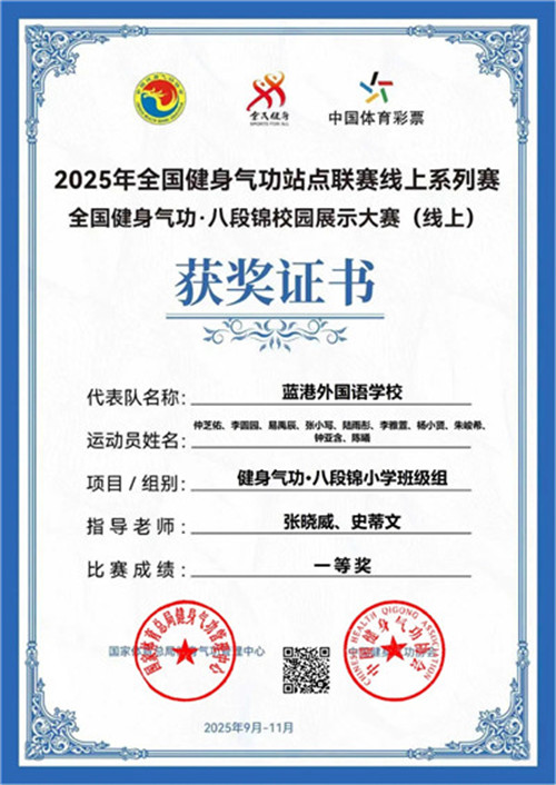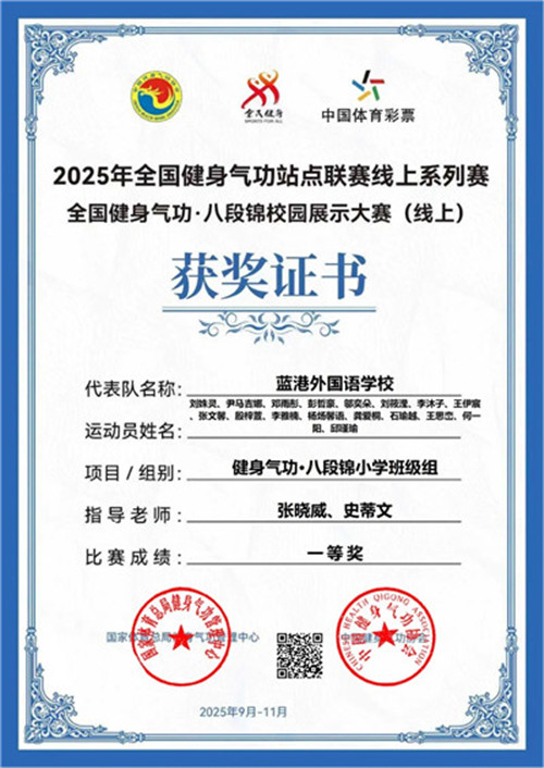 近日,在2025年全国健身气功站点联赛线上系列赛之全国健身气功八段锦校园展示大赛中,成都蓝港外国语学校刘姝灵、尹马吉娜、邓雨彤等17名同学组成的代表队以及仲芝佑、李圆园、易禹辰等10名同学组成的代表队,在全国众多参赛队伍中脱颖而出,均荣获小学班级组一等奖。